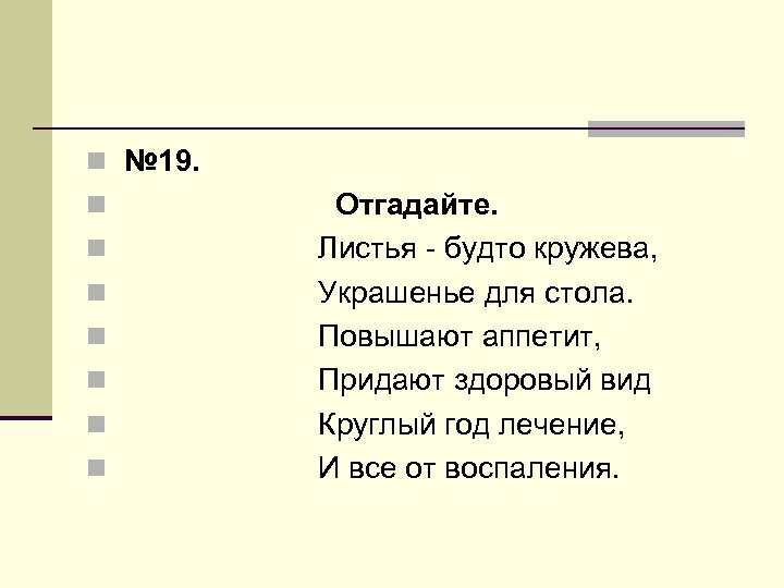 n № 19. n n n n Отгадайте. Листья - будто кружева, Украшенье для стола. Повышают аппетит, Придают здоровый вид Круглый год лечение, И все от воспаления.
