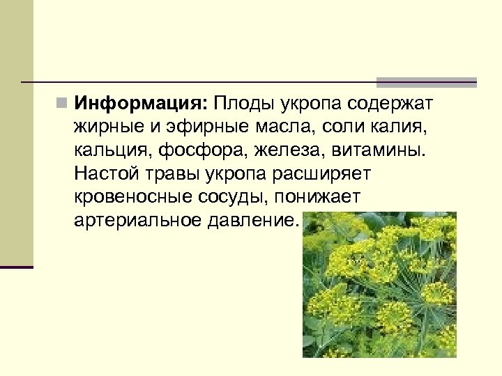 n Информация: Плоды укропа содержат жирные и эфирные масла, соли калия, кальция, фосфора, железа, витамины. Настой травы укропа расширяет кровеносные сосуды, понижает артериальное давление.