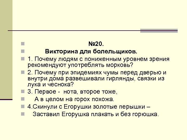 n № 20. n Викторина для болельщиков. n 1. Почему людям с пониженным уровнем зрения n n n рекомендуют употреблять морковь? 2. Почему при эпидемиях чумы перед дверью и внутри дома развешивали гирлянды, связки из лука и чеснока? 3. Первое - нота, второе тоже, А в целом на горох похожа. 4. Скинули с Егорушки золотые перышки – Заставил Егорушка плакать и без горюшка.