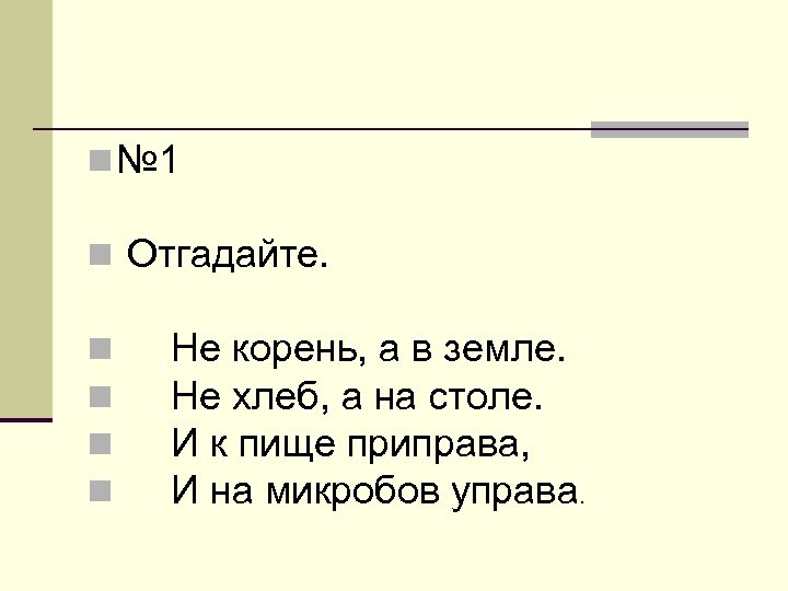n № 1 n Отгадайте. n n Не корень, а в земле. Не хлеб, а на столе. И к пище приправа, И на микробов управа.