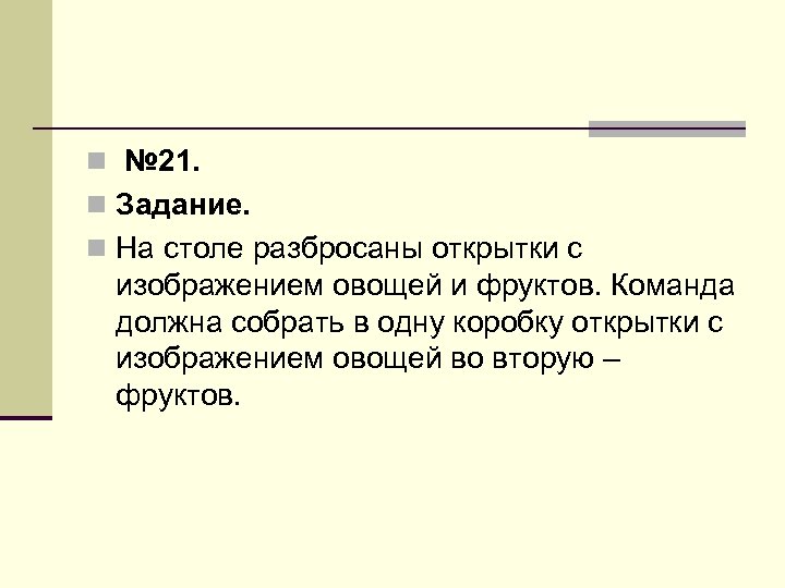 n № 21. n Задание. n На столе разбросаны открытки с изображением овощей и фруктов. Команда должна собрать в одну коробку открытки с изображением овощей во вторую – фруктов.