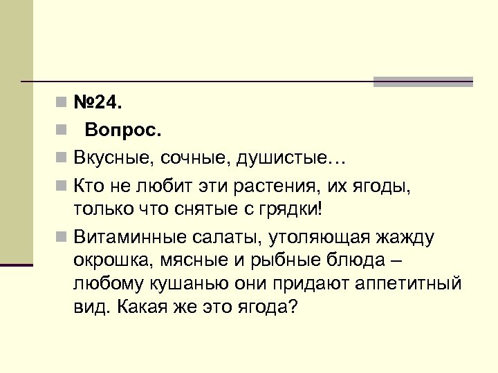 n № 24. n Вопрос. n Вкусные, сочные, душистые… n Кто не любит эти растения, их ягоды, только что снятые с грядки! n Витаминные салаты, утоляющая жажду окрошка, мясные и рыбные блюда – любому кушанью они придают аппетитный вид. Какая же это ягода?
