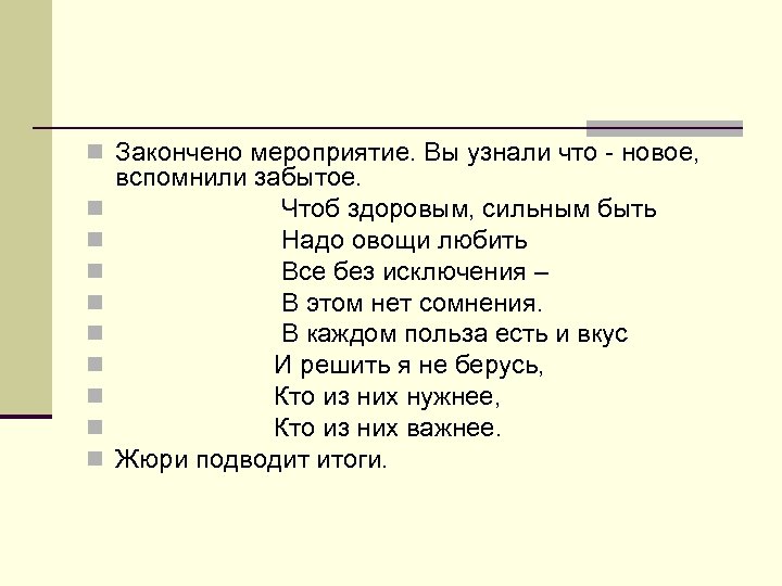n Закончено мероприятие. Вы узнали что - новое, n n n n n вспомнили забытое. Чтоб здоровым, сильным быть Надо овощи любить Все без исключения – В этом нет сомнения. В каждом польза есть и вкус И решить я не берусь, Кто из них нужнее, Кто из них важнее. Жюри подводит итоги.