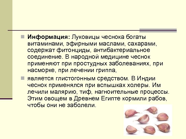 n Информация: Луковицы чеснока богаты витаминами, эфирными маслами, сахарами, содержат фитонциды, антибактериальное соединение. В народной медицине чеснок применяют при простудных заболеваниях, при насморке, при лечении гриппа, n является глистогонным средством. В Индии чеснок применялся при вспышках холеры. Им лечили малярию, тиф, нагноительные процессы. Этим овощем в Древнем Египте кормили рабов, чтобы они не заболели.