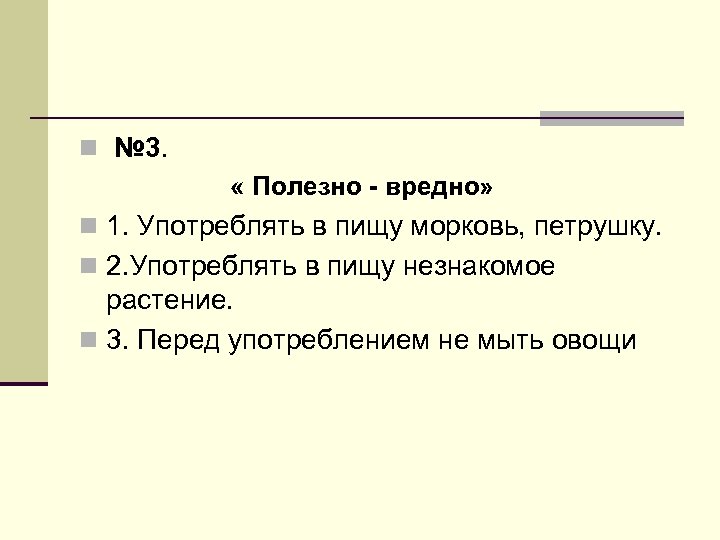 n № 3. « Полезно - вредно» n 1. Употреблять в пищу морковь, петрушку. n 2. Употреблять в пищу незнакомое растение. n 3. Перед употреблением не мыть овощи