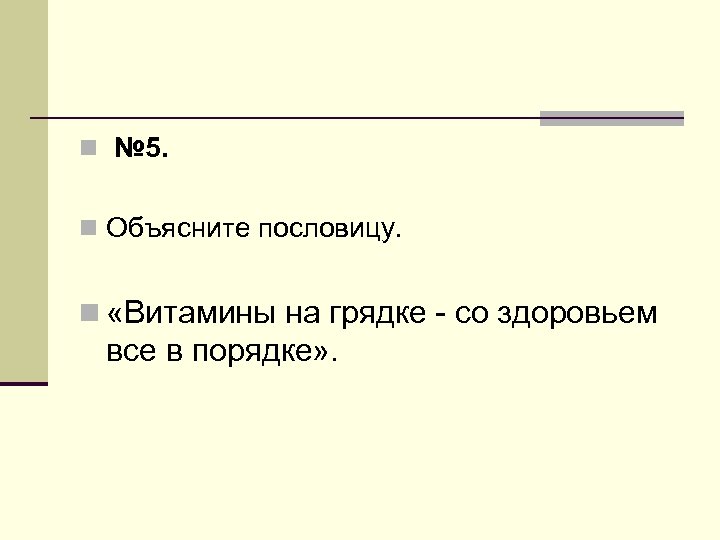 n № 5. n Объясните пословицу. n «Витамины на грядке - со здоровьем все в порядке» .