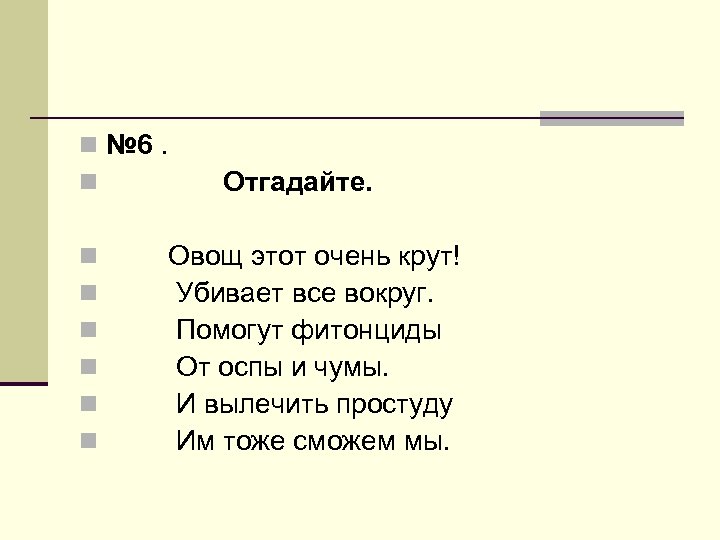 n № 6. n n n n Отгадайте. Овощ этот очень крут! Убивает все вокруг. Помогут фитонциды От оспы и чумы. И вылечить простуду Им тоже сможем мы.