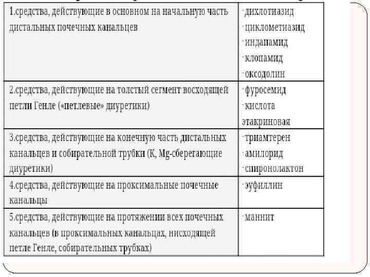 Триамтерен Относится к мочегонным средствам, задерживающим в организме ионы калия и магния. Диуретическая эффективность триамтерена невысокая. Диурез увеличивается за счет угнетения реабсорбции ионов натрия. Одновременно выводятся ионы хлора. Основная локализация действия - собирательные канальцы и дистальные канальцы, в которых препарат снижает проницаемость натриевых каналов (очевидно, блокируя их). В небольшой степени повышает элиминацию мочевой кислоты.