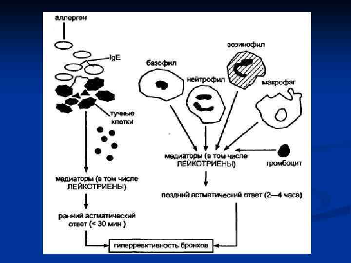Клетки воспаления в дыхательных путях при БА 1. 2. 3. 4. 5. 6. Тучные клетки Эозинофилы Т-лимфоциты Нейтрофилы Макрофаги Базофилы Медиаторы воспаления в дыхательных путях при БА n n n Лейкотриены (цистеиниловые лейкотриены) С 4, D 4 и Е 4 Цитокины: IL-1β, TNF-α, IL-5, IL-13 Гистамин Оксид азота NO – синтезируется в кл-ках эпителия бронхов Простагландин Pg. D 2 – образуется в тучных клетках и обладает выраженным бронхоконстрикторным действием.