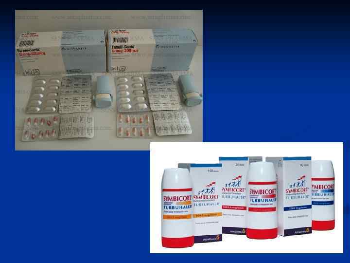 Современные комбинации ИГКС + ДДБА (прием обычно 2 раза в сутки) МНН Будесонид + Формотерол Торговые названия препаратов Формы выпуска Симбикорт Турбухалер Порошок д/ингал. дозир. в 1 дозе: 80 мкг + 4, 5 мкг, 160 + 4, 5 мкг, 320 + 9 мкг Форадил Комби Набор капсул с пор. для ингал. 200 мкг и 12 мкг; 400 мкг и 12 мкг + ингалятор Аэролайзер Возрастные ограничения с 6 лет – 80 + 4, 5 мкг/доза с 12 лет – 160 + 4, 5 мкг и 320 + 9 мкг/доза Форадил Комби – с 6 лет Беклометазон + Формотерол Фостер Аэрозоль д/ингал. дозир. в 1 дозе: 100 мкг + 6 мкг с 12 лет Флутиказон + Салметерол Серетид Мультидиск Тевакомб Спрей д/ингал. дозиров. в 1 дозе: 50 мкг + 25 мкг, 150 + 25 мкг, 250 + 25 мкг с 4 лет – в дозе 50 +25 мкг 2 -4 доз/сут Мометазон + Формотерол Зенхейл Аэрозоль д/ингал. дозир. в 1 дозе: 50 мкг +5 мкг, 100 + 5 мкг, 200 + 5 мкг с 12 лет
