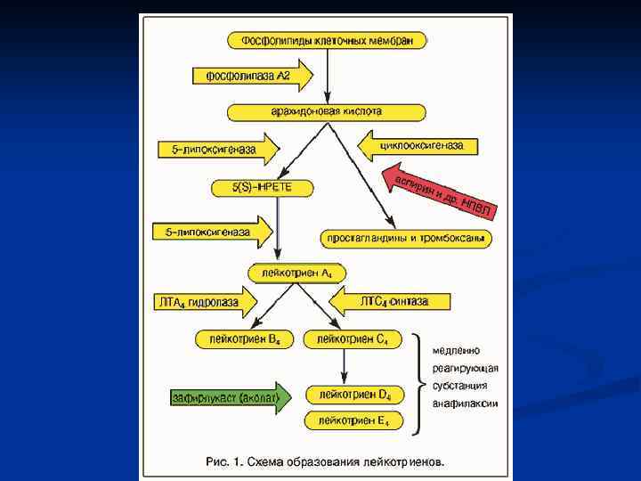 Хроническое воспаление при БА Тучные клетки – локализация тканевая – сод. гранулы гистамина и др медиаторов, в них идёт синтез простагландинов и лейкотриенов − LTC 4, LTD 4. LTE 4 - повышают сосудистую проницаемость, сокращаю гладкую мускулатуру бронхов. усиливают продукцию слизи − LTB 4 – стимулирует хемотаксис нейтрофилов − PGD 2 / PGF 2 альфа - сокращают гладкую мускулатуру бронхов − ТХА 2 - вызывает вазоконстрикцию, сокращает гладкую мускулатуру бронхов, агрегацию тромбоцитов − PAF - повышает сосудистую проницаемость, сокращает гладкую мускулатуру бронхов, вызывает хемотаксис и активацию эозинофилов и нейтрофилов, агрегацию тромбоцитов Тучные клетки секретируют цитокины, в т. ч. интерлейкины: IL-5 – активирует эозинофилы и увеличивает продолжительность их жизни IL-13 – участвует в образовании Ig. E Базофилы – циркулируют в крови – содержат гранулы гистамина и других медиаторов, в них идёт синтез лейкотриенов.