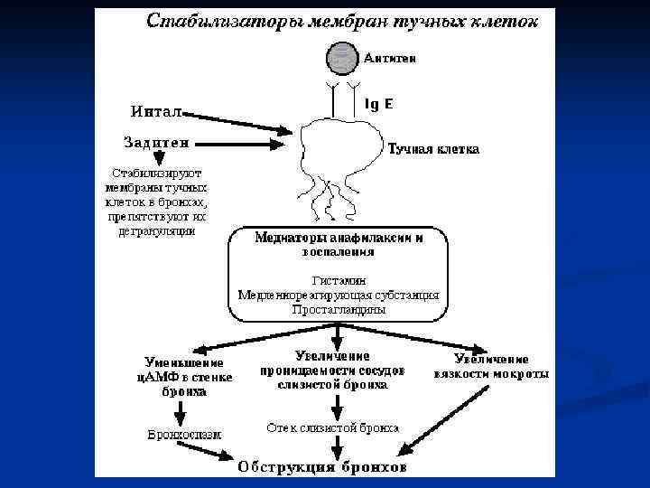 Мембраностабилизаторы - КРОМОНЫ (для регулярного ежедневного применения; НЕ для купирования приступа БА) Международное непатентованное название (МНН) Торговые названия препаратов Кромоглициевая кислота (натрия кромогликат; динатрия хромогликат) Интал Недокромил (натрия) Кромоглин Кром-аллерг Кромогексал Лекролин Хай-кром Налкром Тайлед Минт Формы выпуска Аэрозоль д/инг. дозиров. 5 мг/доза – по 2 инг. 4 р/д Спрей назальный дозиров. 3 мг/доза Капли глазные 2% Р-р д/инг. 1% в неб. 2 мл Капс. 100 мг д/пр. внутрь Аэрозоль д/ингаляций дозированный 2 мг/доза Взрослым и детям c 2 лет: Обыч. доза– по 2 инг. 2 р/сут Макс. доза – 8 ингал. /сут (по 2 инг. 4 р/сут)+ до физ. нагр. Возрастные ограничения Аэр. и р-р д/инг. - с 5 лет Спрей назал. дозир. – с 5 лет Капли глазн. – с 4 лет Капс. – с 2 лет
