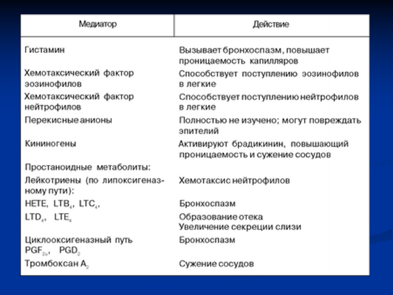 Хроническое воспаление при БА Тучные клетки – локализация тканевая – сод. гранулы гистамина и др медиаторов, в них идёт синтез простагландинов и лейкотриенов LTC4, LTD4. LTE4 - повышают сосудистую проницаемость, сокращаю гладкую мускулатуру бронхов. усиливают продукцию слизи LTB4 – стимулирует хемотаксис нейтрофилов PGD2 / PGF2 альфа - сокращают гладкую мускулатуру бронхов ТХА2 - вызывает вазоконстрикцию, сокращает гладкую мускулатуру бронхов, агрегацию тромбоцитов PAF - повышает сосудистую проницаемость, сокращает гладкую мускулатуру бронхов, вызывает хемотаксис и активацию эозинофилов и нейтрофилов, агрегацию тромбоцитов Тучные клетки секретируют цитокины, в т.ч. интерлейкины: IL-5 – активирует эозинофилы и увеличивает продолжительность их жизни IL-13 – участвует в образовании IgE Базофилы – циркулируют в крови – содержат гранулы гистамина и других медиаторов, в них идёт синтез лейкотриенов.