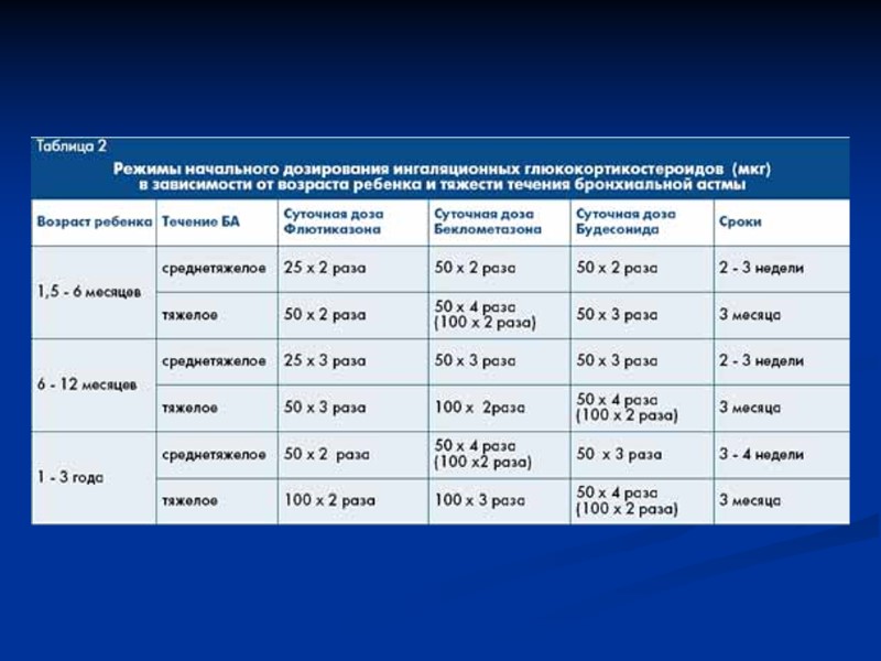 Терапия легкой персистирующей БА (2-я ступень ступенчатой терапии БА) Базисная терапия: Ингаляционные ГКС в низких дозах или Ингибиторы лейкотриеновых рецепторов или они же в комбинации с кромонами (на срок не менее 3 мес. или длительнее) Купирование приступа: Ингаляционные бета-агонисты короткого действия или ингаляционные М-холинолитики или комбинация этих групп (Беродуал) или будесонид (Пульмикорт) через небулайзер При неполном контроле – переход на 3-ю ступень (средне- тяжелая персистирующая БА)