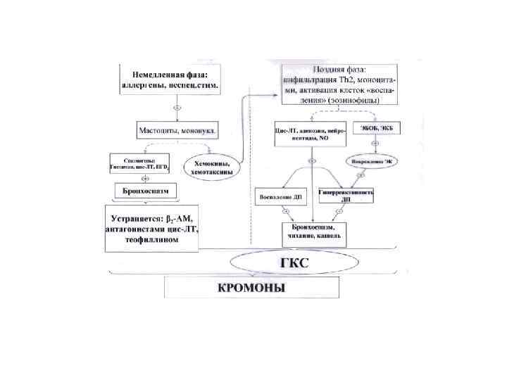 СТАБИЛИЗАТОРЫ МЕМБРАН ТУЧНЫХ КЛЕТОК (КРОМОНЫ) • Подавляют Ig. E-опосредованное высвобождение спазмогенных веществ (гистамина, цис-ЛТ, некоторых нейропептидов) • Угнетают процессы активации эозинофилов и макрофагов, высвобождение цитокинов • Нарушают взаимодействие ФАТ с тромбоцитами и эозинофилами • Предупреждают развитие ранней и поздней фазы бронхиальной обструкции, вызванной аллергенным и холодовым воздействием