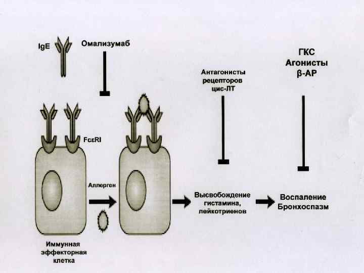 ОМАЛИЗУМАБ • Уменьшает уровень Ig. E в крови • Блокирует процесс связывания Ig. E с рецепторами • Устраняет преимущественно эффекты Ig. E • Угнетает процесс дегрануляции тучных клеток после воздействия аллергена • Подавляет раннюю и позднюю фазы ответа на ингаляцию аллергена • Не вызывает образование антител