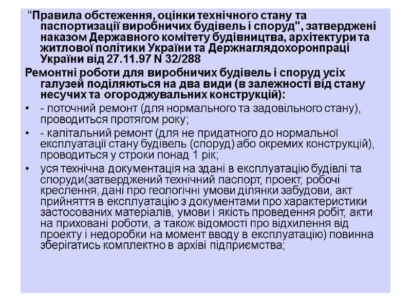"Правила обстеження, оцінки технічного стану та паспортизації виробничих будівель і споруд", затверджені наказом Державного комітету будівництва, архітектури та житлової політики України та Держнаглядохоронпраці України від 27.11.97 N 32/288 Ремонтні роботи для виробничих будівель і споруд усіх галузей поділяються на два види (в залежності від стану несучих та огороджувальних конструкцій): - поточний ремонт (для нормального та задовільного стану), проводиться протягом року; - капітальний ремонт (для не придатного до нормальної експлуатації стану будівель (споруд) або окремих конструкцій), проводиться у строки понад 1 рік; уся технічна документація на здані в експлуатацію будівлі та споруди(затверджений технічний паспорт, проект, робочі креслення, дані про геологічні умови ділянки забудови, акт прийняття в експлуатацію з документами про характеристики застосованих матеріалів, умови і якість проведення робіт, акти на приховані роботи, а також відомості про відхилення від проекту і недоробки на момент вводу в експлуатацію) повинна зберігатись комплектно в архіві підприємства;
