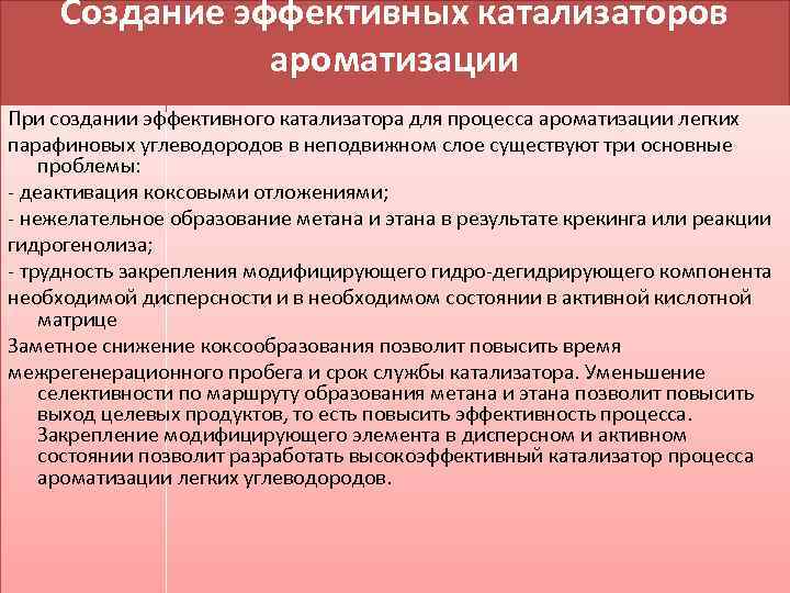 Создание эффективных катализаторов ароматизации При создании эффективного катализатора для процесса ароматизации легких парафиновых углеводородов в неподвижном слое существуют три основные проблемы: - деактивация коксовыми отложениями; - нежелательное образование метана и этана в результате крекинга или реакции гидрогенолиза; - трудность закрепления модифицирующего гидро-дегидрирующего компонента необходимой дисперсности и в необходимом состоянии в активной кислотной матрице Заметное снижение коксообразования позволит повысить время межрегенерационного пробега и срок службы катализатора. Уменьшение селективности по маршруту образования метана и этана позволит повысить выход целевых продуктов, то есть повысить эффективность процесса. Закрепление модифицирующего элемента в дисперсном и активном состоянии позволит разработать высокоэффективный катализатор процесса ароматизации легких углеводородов.