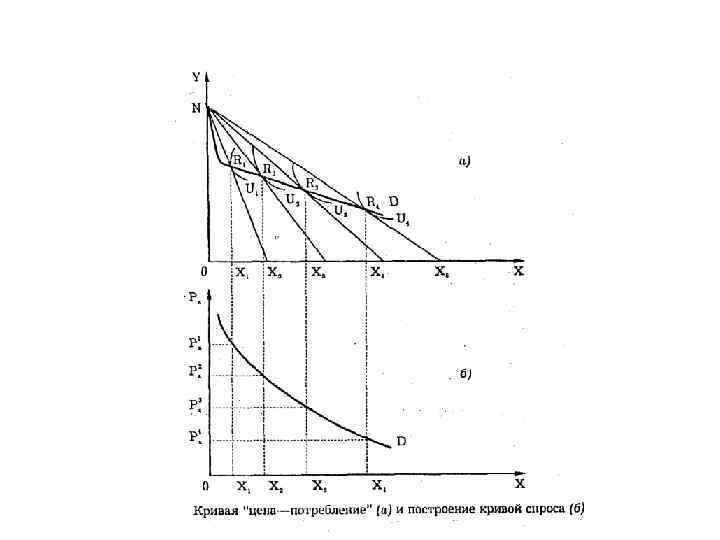Кривая, связывающая все точки равновесия потребителя при изменении в ценах, называется кривая «цена – потребление» . Кривая «цена – потребление» позволяет построить кривую спроса на соответствующее благо Кривая спроса и кривая «цена – потребление» - два способа описания зависимости количества блага от изменения цены на него