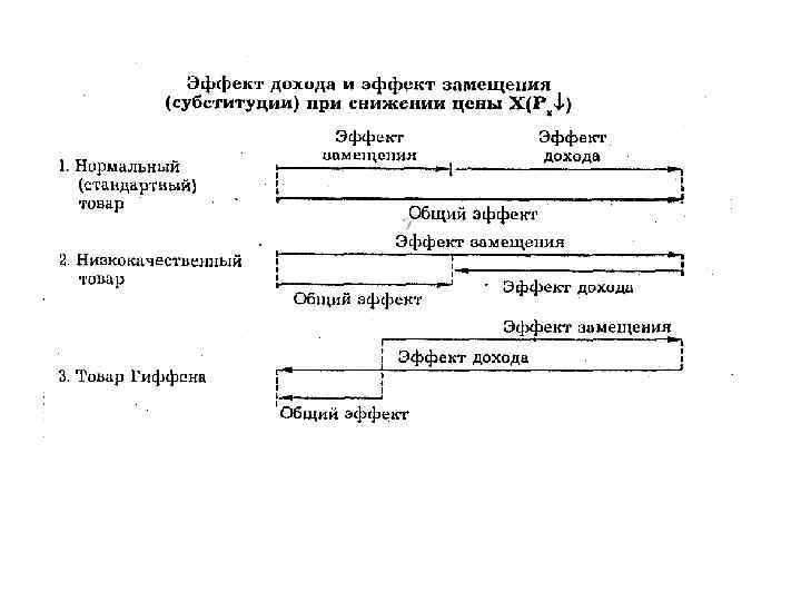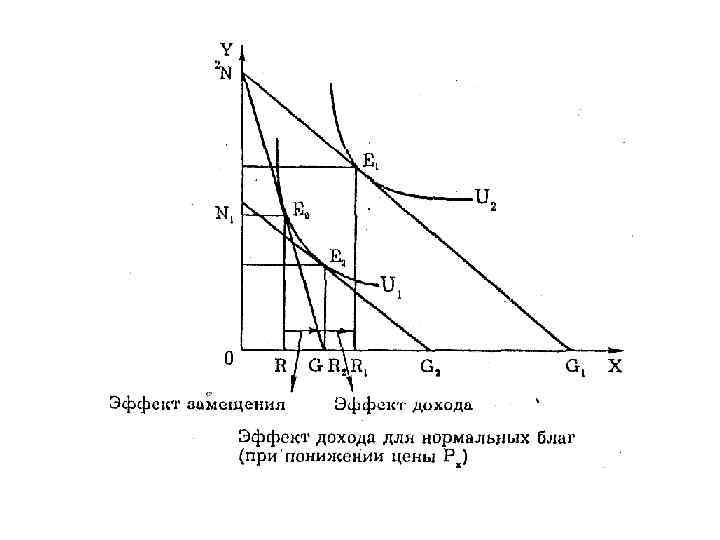 Эффект замещения и эффект дохода Эффект замещения – это изменение в потреблении товара только в результате изменения его цены по отношению к ценам всех других благ; то есть изменение в объёме покупок товара (за период времени), которое наблюдалось бы, если бы реальный доход потребителя был откорректирован так, чтобы от изменения цены его благосостояние и не ухудшилось бы и не улучшилось бы Эффект дохода – изменение в потреблении товара в ответ на изменение в его цене, рассматриваемое только как результат изменения реального дохода потребителя (его способности приобретать больше или меньше данного товара) Эффект дохода возникает потому, что изменение цены неизбежно изменяет реальный доход потребителя, следовательно, потребитель не может оставаться на первоначально кривой безразличия, но должен переместиться на новую кривую безразличия