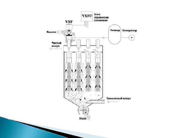 Под действием центробежной силы частицы пыли прижимаются к внутренним стенкам наружного цилиндра и скатываются в пылесборник. Циклоны широко применяются для улавливания частиц размерами более 10 мкм, то есть при грубой и средней очистке газа от аэрозолей.