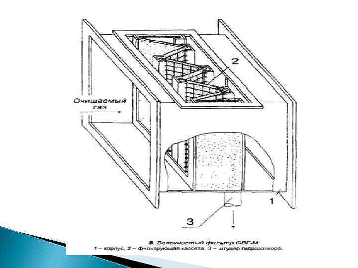 В ряде случаев для очистки газового потока от взвесей применяются фильтры. В таких устройствах газовый поток проходит через волокно (фильтрующий материал), при этом частицы, обладающие инерцией, сталкиваются с ним и захватываются. В зависимости от фильтрующего материала фильтры разделяются на: ◦ тканевые (хлопок, шерсть, химические волокна, и др. ); ◦ волокнистые (стекловолокно, хлопок с асбестом, асбоцеллюлоза); ◦ зернистые (керамика, металлокерамика, пластмасса).