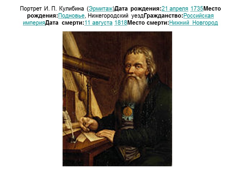 Портрет И. П. Кулибина (Эрмитаж)Дата рождения:21 апреля 1735Место рождения:Подновье, Нижегородский уездГражданство:Российская империяДата смерти:11 августа 1818Место смерти:Нижний Новгород