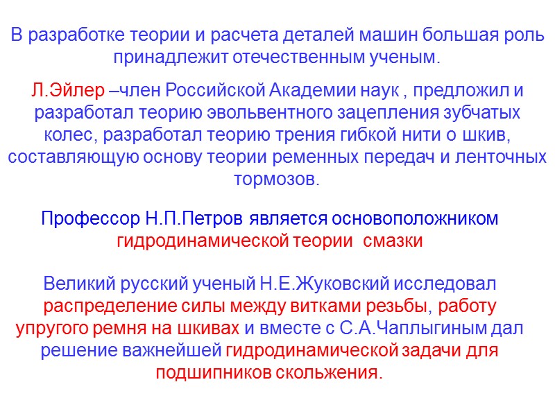 В разработке теории и расчета деталей машин большая роль принадлежит отечественным ученым. Л.Эйлер –член Российской Академии наук , предложил и разработал теорию эвольвентного зацепления зубчатых колес, разработал теорию трения гибкой нити о шкив, составляющую основу теории ременных передач и ленточных тормозов. Профессор Н.П.Петров является основоположником гидродинамической теории смазки Великий русский ученый Н.Е.Жуковский исследовал распределение силы между витками резьбы, работу упругого ремня на шкивах и вместе с С.А.Чаплыгиным дал решение важнейшей гидродинамической задачи для подшипников скольжения.