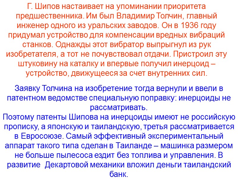 Г. Шипов настаивает на упоминании приоритета предшественника. Им был Владимир Толчин, главный инженер одного из уральских заводов. Он в 1936 году придумал устройство для компенсации вредных вибраций станков. Однажды этот вибратор выпрыгнул из рук изобретателя, а тот не почувствовал отдачи. Пристроил эту штуковину на каталку и впервые получил инерцоид – устройство, движущееся за счет внутренних сил. Заявку Толчина на изобретение тогда вернули и ввели в патентном ведомстве специальную поправку: инерцоиды не рассматривать. Поэтому патенты Шипова на инерцоиды имеют не российскую прописку, а японскую и таиландскую, третья рассматривается в Евросоюзе. Самый эффективный экспериментальный аппарат такого типа сделан в Таиланде – машинка размером не больше пылесоса ездит без топлива и управления. В развитие Декартовой механики вложил деньги таиландский банк.