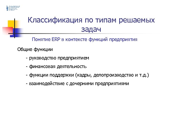 Классификация по типам решаемых задач Понятие ERP в контексте функций предприятия Общие функции - руководство предприятием - финансовая деятельность - функции поддержки (кадры, делопроизводство и т. д. ) - взаимодействие с дочерними предприятиями