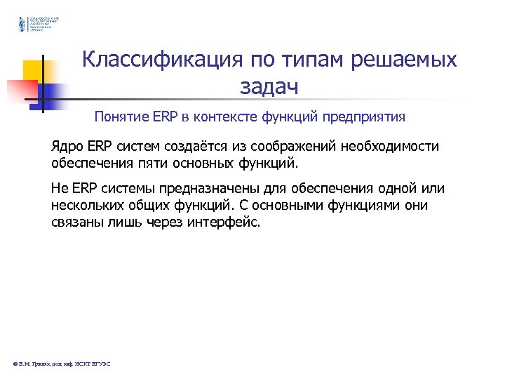 Классификация по типам решаемых задач Понятие ERP в контексте функций предприятия Ядро ERP систем создаётся из соображений необходимости обеспечения пяти основных функций. Не ERP системы предназначены для обеспечения одной или нескольких общих функций. С основными функциями они связаны лишь через интерфейс. © В. М. Гриняк, доц. каф. ИСКТ ВГУЭС