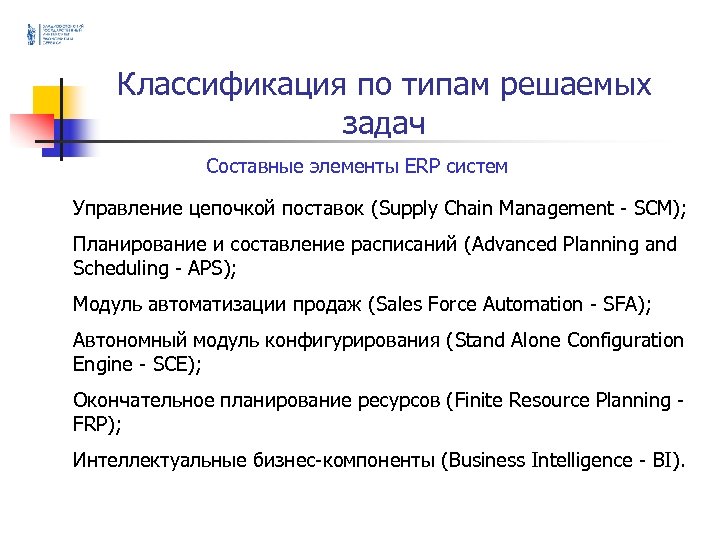 Классификация по типам решаемых задач Составные элементы ERP систем Управление цепочкой поставок (Supply Chain Management - SCM); Планирование и составление расписаний (Advanced Planning and Scheduling - APS); Модуль автоматизации продаж (Sales Force Automation - SFA); Автономный модуль конфигурирования (Stand Alone Configuration Engine - SCE); Окончательное планирование ресурсов (Finite Resource Planning FRP); Интеллектуальные бизнес-компоненты (Business Intelligence - BI).