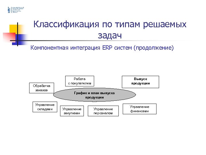 Классификация по типам решаемых задач Компонентная интеграция ERP систем (продолжение) Обработка заказов Управление складами Работа с покупателем Выпуск продукции График и план выпуска продукции Управление закупками Управление персоналом Управление финансами