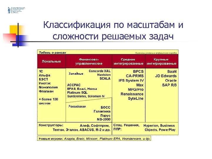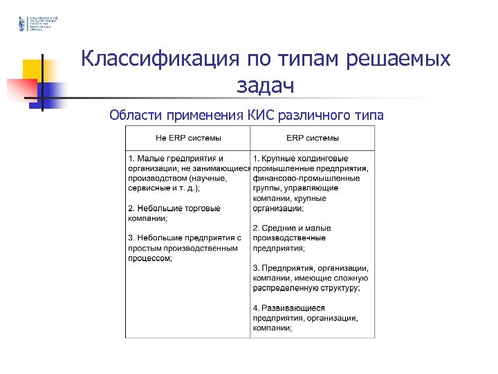 Классификация по типам решаемых задач Понятие ERP в контексте функций предприятия