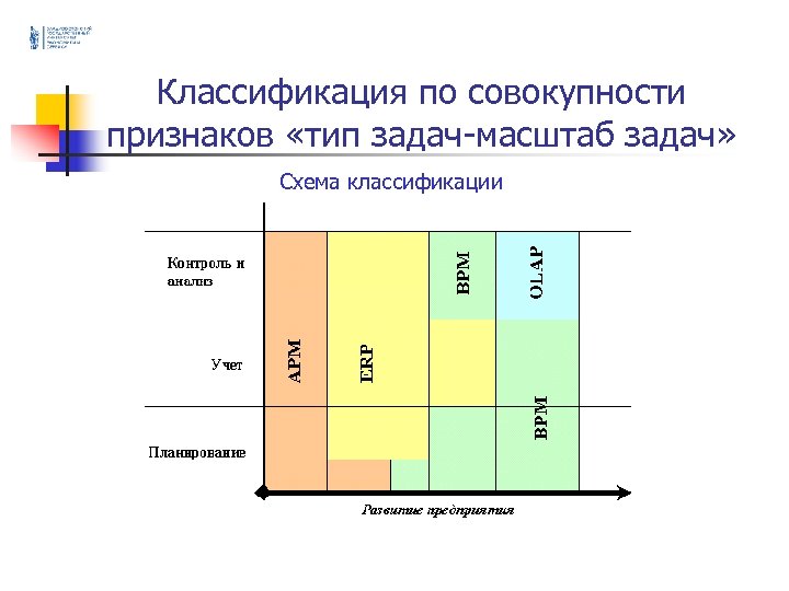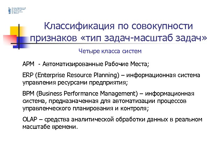 Классификация по совокупности признаков «тип задач-масштаб задач» Четыре класса систем APM - Автоматизированные Рабочие Места; ERP (Enterprise Resource Planning) – информационная система управления ресурсами предприятия; BPM (Business Performance Management) – информационная система, предназначенная для автоматизации процессов управленческого планирования и контроля; OLAP – средства аналитической обработки данных в реальном масштабе времени.