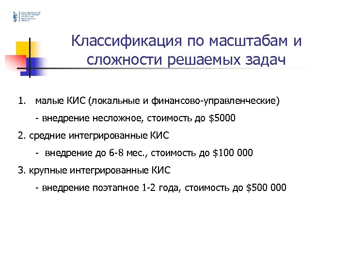Классификация по масштабам и сложности решаемых задач 1. малые КИС (локальные и финансово-управленческие) - внедрение несложное, стоимость до $5000 2. средние интегрированные КИС - внедрение до 6 -8 мес. , стоимость до $100 000 3. крупные интегрированные КИС - внедрение поэтапное 1 -2 года, стоимость до $500 000