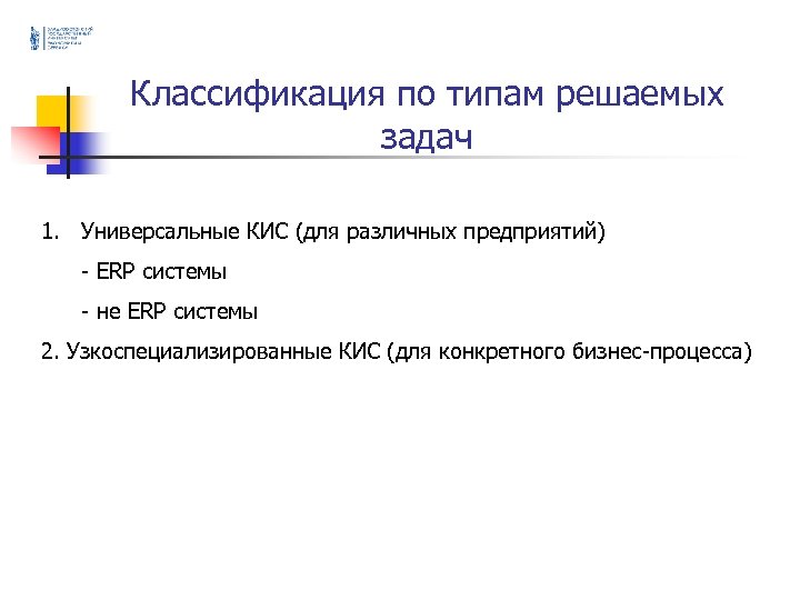 Классификация по типам решаемых задач 1. Универсальные КИС (для различных предприятий) - ERP системы - не ERP системы 2. Узкоспециализированные КИС (для конкретного бизнес-процесса)