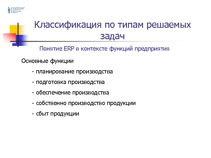 Классификация по типам решаемых задач Понятие ERP в контексте функций предприятия Основные функции - планирование производства - подготовка производства - обеспечение производства - собственно производство продукции - сбыт продукции
