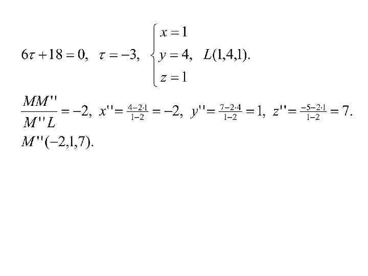 Пример: Найти точки, симметричный т. M(4, 7, -5) π относительно прямой • l K • • M’ M l и плоскости