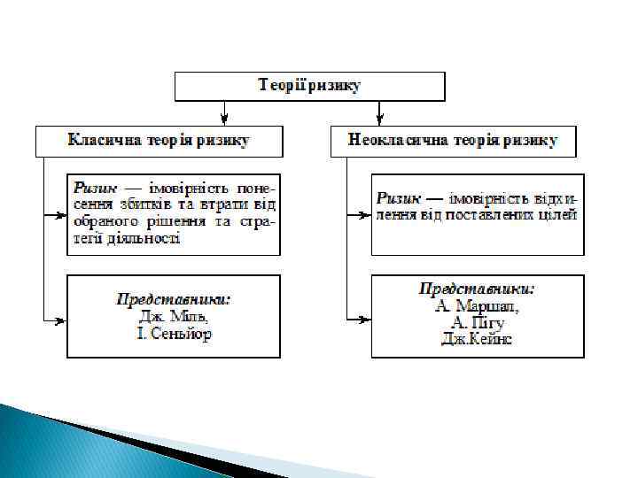 Інтерпретації категорії «ризик» ризик — це ймовірність (можливість) здобуття ризик — невизначеність майбутнього стану, ризик — це діяльність, пов’язана з подоланням тільки небажаного результату або (чи тільки) ймовірність сприятливого позитивного результату: удача, шанс отримати додатковий прибуток; внутрішньої ситуації та зовнішнього середовища, невпевненість у результаті певних дії; невизначеності у ситуації неминучого вибору, в процесі якої є можливість кількісно та якісно оцінити ймовірність досягнення передбачуваного результату та відхилення від мети.