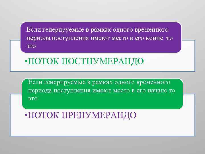 Если генерируемые в рамках одного временного периода поступления имеют место в его конце то это • ПОТОК ПОСТНУМЕРАНДО Если генерируемые в рамках одного временного периода поступления имеют место в его начале то это • ПОТОК ПРЕНУМЕРАНДО