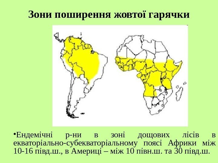 Зони поширення жовтої гарячки • Ендемічні р-ни в зоні дощових лісів в екваторіально-субекваторіальному поясі Африки між 10 -16 півд. ш. , в Америці – між 10 півн. ш. та 30 півд. ш.