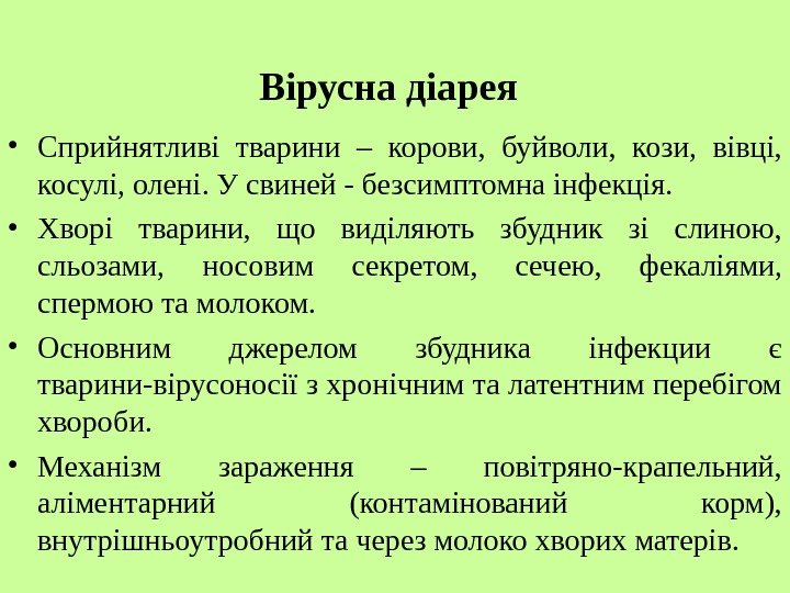 Вірусна діарея • Сприйнятливі тварини – корови, буйволи , кози, вівці, косулі, олені. У свиней — безсимптомна інфекція. • Хворі тварини, що виділяють збудник зі слиною, сльозами, носовим секретом, сеч е ю, фекаліями, спермою та молоком. • Основним джерелом збудника інфекции є тварини-вірусоносії з хронічним та латентним перебігом хвороби. • Механізм зараження – повітряно-крапельний, аліментарний (контамінований корм), внутрішньоутробний та через молоко хворих матерів.