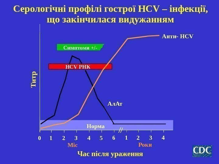 Серологічні профілі гострої HCV – інфекції, що закінчилася видужанням Симптоми +/- Час після ураження. Т и т р Анти- HCV Ал. Ат Норма 0 1 2 3 4 5 6 1 2 3 4 Роки Міс. HCV РНК