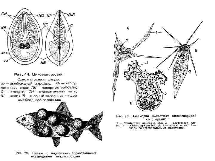 Тип MYXOZOA (миксоспоридии) • Паразиты рыб и малощетинковых червей, около 1100 видов. • Жизненный цикл включает развитие паразита от одноядерной фазы к многоядерной, которая заканчивается образованием множества многоклеточных спор с двуядерным амебоидным зародышем. В зародыше происходит слияние ядер – автогамия. • Взрослым свойственен ядерный дуализм. • По последним данным представителей myxozoa следует относить к многоклеточным животным.