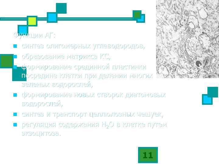 Функции АГ: n синтез олигомерных углеводородов, n образование матрикса КС, n формирование срединной пластинки посредине клетки при делении многих зеленых водорослей, n формирование новых створок диатомовых водорослей, n синтез и транспорт целлюлозных чешуек, n регуляция содержания Н 2 О в клетке путем экзоцитоза. 11