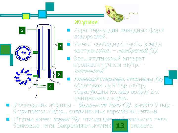 n n Жгутики n Характерны для монадных форм 2 водорослей. 1 n Имеют свободную часть, всегда одетую ц/пл. – мембраной (1). n Весь жгутиковый аппарат пронизан пучком мк/тр. – аксонемой. 3 n Главный стержень аксонемы (2) образован из 9 пар мк/тр, 4 образующих кольцо вокруг 2 -х центральных мк/тр. В основании жгутика – базальное тело (3): вместо 9 пар – 9 триплетов мк/тр. , соединенных короткими нитями. Жгутик имеет корни (4): отходящие от базального тела белковые нити. Закрепляют жгутик в 13 протопласте.
