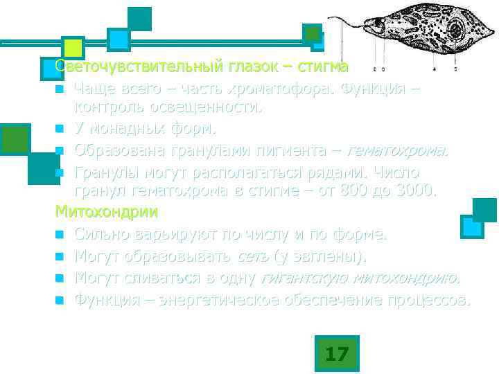 Светочувствительный глазок – стигма n Чаще всего – часть хроматофора. Функция – контроль освещенности. n У монадных форм. n Образована гранулами пигмента – гематохрома. n Гранулы могут располагаться рядами. Число гранул гематохрома в стигме – от 800 до 3000. Митохондрии n Сильно варьируют по числу и по форме. n Могут образовывать сеть (у эвглены). n Могут сливаться в одну гигантскую митохондрию. n Функция – энергетическое обеспечение процессов. 17