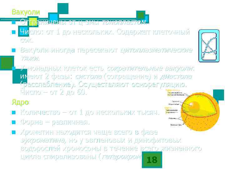 Вакуоли n Отграничены от ц-змы тонопластом. n Число: от 1 до нескольких. Содержат клеточный сок. n Вакуоли иногда пересекают цитоплазматические тяжи. n У монадных клеток есть сократительные вакуоли: имеют 2 фазы: систола (сокращение) и диастола (расслабление). Осуществляют осморегуляцию. Число – от 2 до 60. Ядро n Количество – от 1 до нескольких тысяч. n Форма – различная. n Хроматин находится чаще всего в фазе эухроматина, но у эвгленовых и динофитовых водорослей хромосомы в течение всего жизненного цикла спирализованы (гетерохроматин). 18