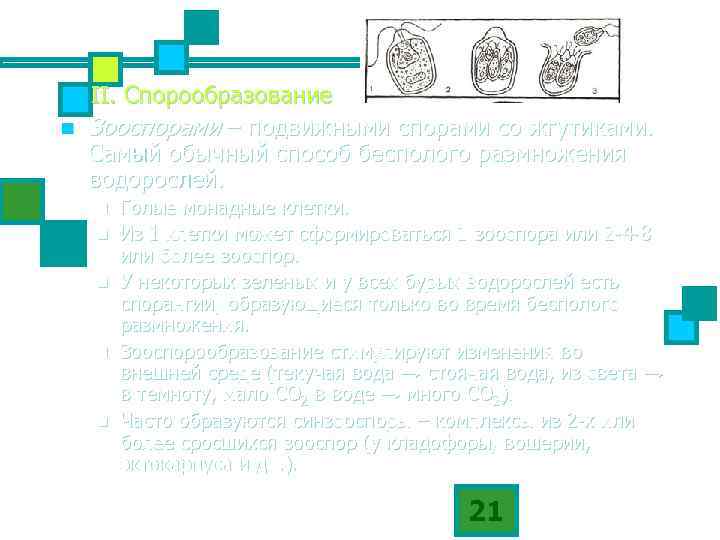 n II. Спорообразование Зооспорами – подвижными спорами со жгутиками. Самый обычный способ бесполого размножения водорослей. n n n Голые монадные клетки. Из 1 клетки может сформироваться 1 зооспора или 2 -4 -8 или более зооспор. У некоторых зеленых и у всех бурых водорослей есть спорангии, образующиеся только во время бесполого размножения. Зооспорообразование стимулируют изменения во внешней среде (текучая вода → стоячая вода, из света → в темноту, мало СО 2 в воде → много СО 2). Часто образуются синзооспоры – комплексы из 2 -х или более сросшихся зооспор (у кладофоры, вошерии, эктокарпуса и др. ). 21